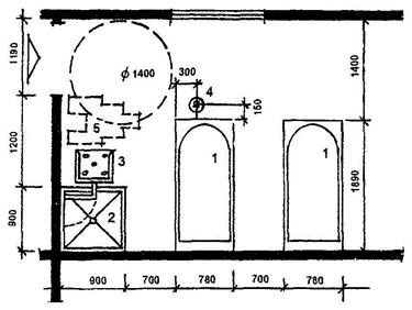 Зрительный зал предусматривается с учетом расстановки, наряду с местами для обычных ходячих зрителей, мест для инвалидов-колясочников (рис. 7.1). Количество мест, которые следует предусматривать для инвалидов-колясочников, определяется заданием на проектирование.