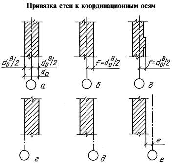 4.6. Внутренняя координационная плоскость наружных самонесущих и навесных стен должна совмещаться с координационной осью (черт. 9д) или смещаться на размер е с учетом привязки несущих конструкций в плане и особенностей примыкания стен к вертикальным несущим конструкциям или перекрытиям (черт. 9е).