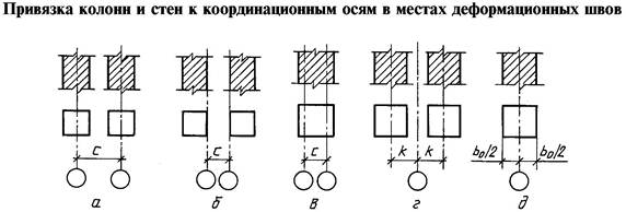 1) расстояние с между парными координационными осями (черт. 11а, б, в) должно быть кратным модулю 3М и, при необходимости, М или 1/2М; привязка каждой из колонн к координационным осям должна приниматься в соответствии с требованиями п. 4.7;