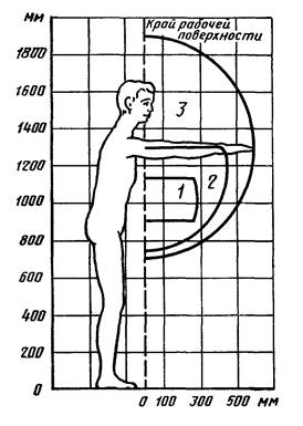 часто используемые и менее важные органы управления не допускается располагать за пределами зоны 2, а при тяжелой работе - выше 1000 мм от площадки, на которой стоит рабочий;