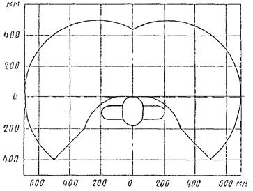 2.1. Конструкцией рабочего места должно быть обеспечено выполнение трудовых операций в пределах зоны досягаемости моторного поля. Зоны досягаемости моторного поля в вертикальной и горизонтальной плоскостях для средних размеров тела человека приведены на черт. 1 и 2.