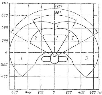 1 - зона для размещения наиболее важных и очень часто используемых органов управления (оптимальная зона моторного поля); 2 - зона для размещения часто используемых органов управления (зона легкой досягаемости моторного поля); 3 - зона для размещения редко используемых органов управления (зона досягаемости моторного поля) |
