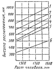 Номограмма зависимости высоты рабочей поверхности для разных видов работ (1 - 4), пространства для ног (5) и высоты рабочего сиденья (6) от роста человека