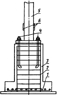 1 - арматура подошвы; 2 - арматура фундамента; 3 - фундамент; 4 - фундаментные болты (не менее двух), соединенные с арматурой фундамента; 5 - стальная колонна; 6 - пластины для приварки проводников заземления