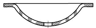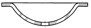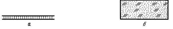 7. Узкие и длинные площади сечений (например, штампованных, вальцованных и других подобных деталей), ширина которых на чертеже от 2 до 4 мм, допускается штриховать полностью только на концах и у контуров отверстий, а остальную площадь сечения - небольшими участками в нескольких местах (черт. 5 и 6). Линии штриховки стекла (черт. 7) следует наносить с наклоном 15-20 ° к линии большей стороны контура сечения.