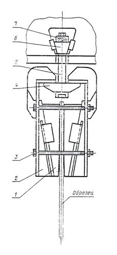 Приспособление (см. справочное приложение 1), состоящее из двух агрегатов, соединенных с нагружающим механизмом машины и передающих усилие на образец с помощью натяга, создаваемого клиновидными губками. Сопрягающиеся с образцом поверхности губок должны иметь рифление и скос, постепенно уменьшающий давление на образец от максимальной величины до нуля (см. справочное приложение 2). Предельное значение шкалы силоизмерителя испытательной машины не должно превышать нагрузку Fраз более чем в 3 раза.