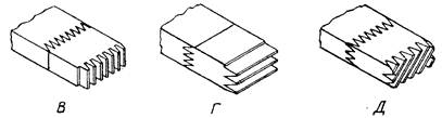 1.2. Зубчатые клеевые соединения в зависимости от расположения типов по отношению к пласти склеиваемых заготовок разделяют на три вида: В - вертикальное, Г - горизонтальное, Д - диагональное (черт. 2).