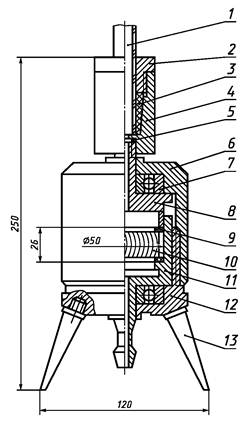 1 - стеклянная трубка; 2 - пробка сальника; 3 - резиновая трубка; 4 - корпус сальника; 5 - резиновая прокладка; 6 - верхняя часть корпуса; 7 - подшипник; 8 - верхний зажим; 9 - кольцевая резиновая прокладка; 10 - образец; 11 - нижний зажим; 12 - нижняя часть корпуса; 13 - шпилька