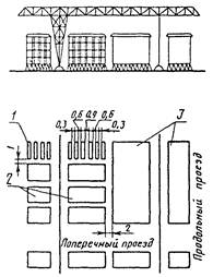 Планировка групп штабелей при укладывании козловым краном пиломатериалов кольцесосудистых пород, а также граба и клена |