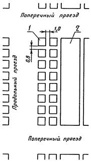 1.5. Группы штабелей отделяются между собой продольными проездами шириной не менее 10 м и поперечными разрывами или проездами шириной не менее 5 м, одинаковыми по ширине на всем протяжении.
