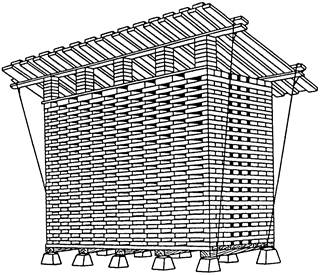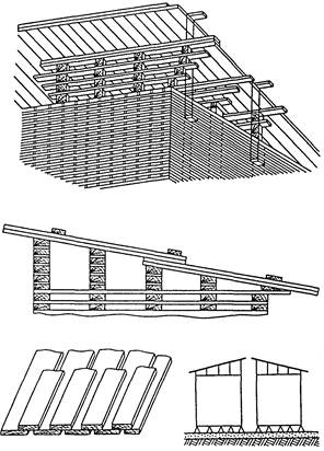 Прогоны должны быть сечением: одиночные - 150´120 мм, двойные 50´120 мм и укладываться в пазы опор фундамента на кромку.