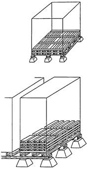 Переводы должны быть сечением не менее 75´75 мм. При штабелировании заготовок и короткомерных пиломатериалов переводы размещают на прогонах со смещением относительно оси опор фундамента в зависимости от длины укладываемых пиломатериалов или заготовок (черт. 12 приложения 1).