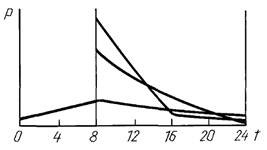 На основании этих двух кривых изменение в теплоотдаче тепла, выходящего в заданный момент как функция времени за цикл 24 ч, получают графически.