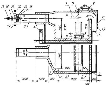 1 - испытательная камера; 2 - дверца; 3 - шарнирная петля; 4 - крючки; 5 - полоска из пористой резины; 6 - U-образный профиль; 7 - входное отверстие; 8 - выходная труба; 9 - втулка; 10 - ограничитель температуры; 11 - ролик; 12 - противовес; 13 - выключатель; 14 - вентилятор; 15 - двигатель; 16 - электромагнитное сцепление; 17 - регулятор; 18 - тахометр; 19 - датчик скорости вращения; 20 - измерительный прибор; 21 - самопишущий милливольтметр