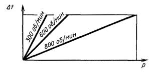 Зависимость между теплоотдачей прибора во время испытания и превышением температуры воздуха, проходящего через калориметр, представляют в виде характеристик различных скоростей вращения вентилятора (т.е. нескольких значений расхода воздуха, черт. 9).