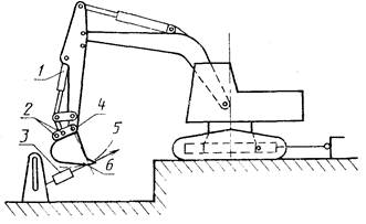 1 - гидроцилиндр ковша; 2 - альтернативные положения пальца; 3 - динамометр; 4 - шарнир крепления ковша; 5 - усилие на рабочем органе; 6 - кромка ковша