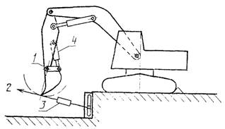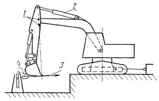 1 - шарнир крепления ковша; 2 - усилие на рабочем органе; 3 - динамометр; 4 - гидроцилиндр ковша