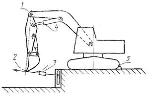 1 - шарнир крепления рукояти; 2 - усилие на рабочем органе; 3 - динамометр; 4 - гидроцилиндр рукояти; 5 - машина может быть блокирована при скольжении
