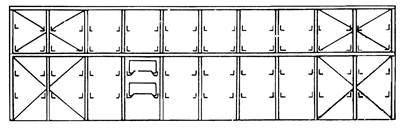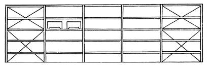 4. Грузонесущим элементом стеллажей типа 2 являются консольные элементы, присоединенные к ветвям стоек. Эти элементы обычно конструируются, в виде уголков, выполняющих одновременно роль планок стержневой решетки стойки, но могут быть и в виде коротких элементов. Продольные связи, соединяющие стойки, устанавливаются в передней и задней плоскостях, причем поверху - обязательно.