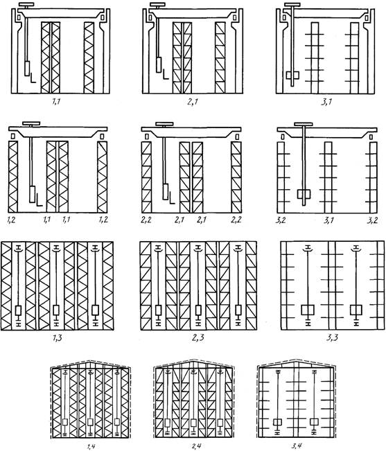 1. Схемы фронтальных проекций стеллажей представлены на черт. 1, схемы поперечных разрезов складов, оборудованных стеллажами и кранами-штабелерами, даны на черт. 2.