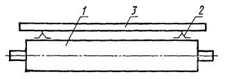 Метод проверки. К образующей контактного вальца 1 (черт. 2), на двух опорах 2 (плоскопараллельных концевых мерах длины) одинаковой высоты, прикладывают поверочную линейку 3.