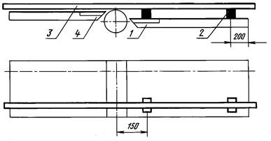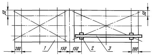 На рабочую поверхность столов 1 в заданном сечении на двух опорах 2 одинаковой высоты устанавливают поверочную линейку 3.