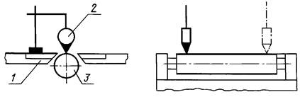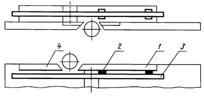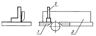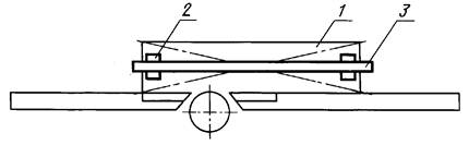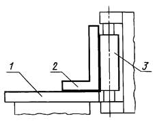 На рабочую поверхность направляющей линейки 1 в заданном сечении на двух опорах 2 одинаковой высоты устанавливают поверочную линейку 3.
