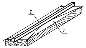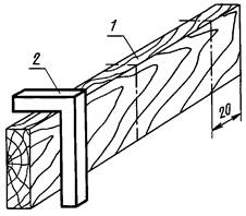 К обработанным на станке пласти и кромке 1 в заданных сечениях прикладывают поверочный угольник 2.