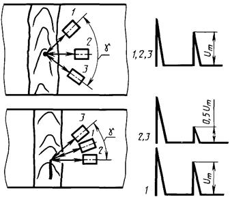 сравнение угла g между крайними положениями преобразователями, соответствующими уменьшению максимальной амплитуды эхо-сигнала от края дефекта Um в два раза, со значением g0, установленным технической документацией на контроль.