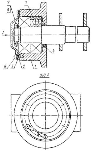 1 - колесо; 2 - прокладка; 3 - подшипник 315 или 316 по ГОСТ 8338-75; 4 - манжета 2.1-90´120-1 или 2.1-95´120-1 по ГОСТ 8752 - 79; 5 - крышка; 6 - болт 3М 12´30.58 по ГОСТ 7798-70