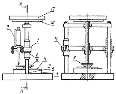 1 - основание; 2 - столик; 3 - шток; 4 - образец; 5 - опорная пластина; 6 - втулка, 7 - траверса; 8 - наконечник; 9 - индикатор часового типа; 10 - тарелка; 11 - стопорный винт; 12 - груз