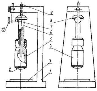 1 - станина; 2 - наконечник молотка; 3 - образец; 4 - молоток; 5 - выпускное отверстие; 6 - золотник; 7 - кулачок фиксатора; 8 - резиновая прокладка; 9 - направляющий стержень; 10 - фиксатор