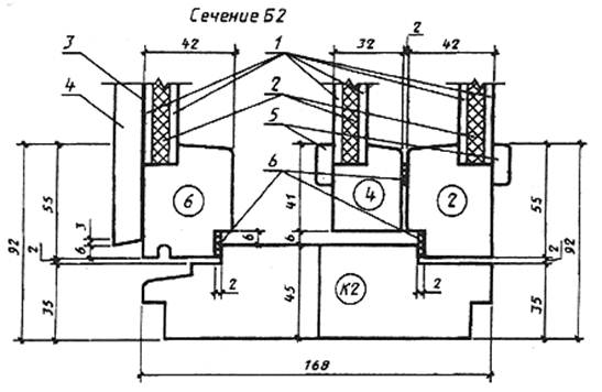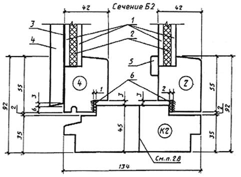 1 - твердая ДВП марки Т группы А толщиной 3,2 - 4 мм по ГОСТ 4598; 2 - мягкая ДВП толщиной 8 мм по ГОСТ 4598; 3 - пергамин по ГОСТ 2697; 4 - обшивка типа О-2 по ГОСТ 8242; 5 - раскладки; 6 - уплотняющие прокладки по ГОСТ 10174