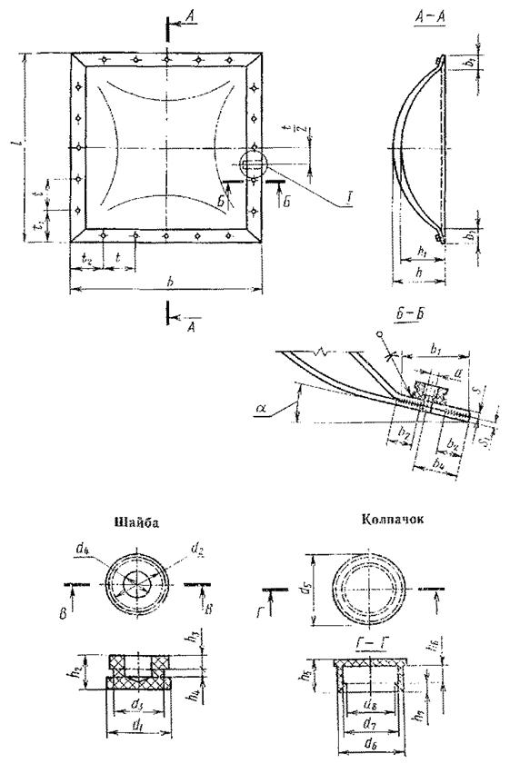 1.2. Форма, размеры куполов и их элементов, колпачков, расположение шайб должны соответствовать указанным на черт. 1-2 и в таблице.