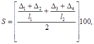 где D1, D2, D3, D4 - разности конечных (в конце испытания) и начальных отсчетов по четырем индикаторам, мм;