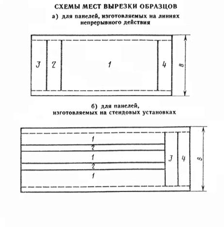 5.7.4. Прочность пенополиуретана при растяжении и сдвиге определяют по ГОСТ 22695-77. Прочность сцепления пенополиуретана с металлическими листами допускается определять по ГОСТ 22695-77, при этом следует указывать характер разрушения образцов. Места вырезки образов принимают по схеме, приведенной на черт. 7. Количество образцов для испытаний принимают в соответствии с п. 4.5.