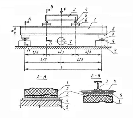 устанавливают прокладки 6 и стальные пластины 5 между опорами базы и образцом, между опорами траверсы и образцом;