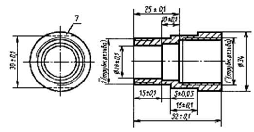 1 - резьбовая с обеих концов труба диаметром 25 мм длиной 200 мм; 2 - двухходовой закрывающийся клапан; 3 - соединительная муфта; 4 - проходной угольник с углом 90° диаметром 25 мм по ГОСТ 8946-75; 5 - переходная муфта диаметром 25 мм в соответствии с исполнениями I и II по ГОСТ 8960-75; 6 - муфты диаметром 25 мм по ГОСТ 8955-75 и ГОСТ 8957-75; 7 - ниппель диаметром 25 мм по ГОСТ 8958-75