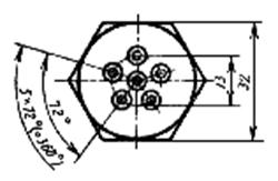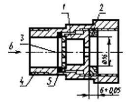 1 - вкладыш; 2 - прижимное кольцо с резьбой; (пред. откл. диаметра ± 0,1 мм); 3 - диск с четырьмя отверстиями; 4 - корпус; 5 - уплотнительное кольцо; 6 - направление потока; 7 - 2 фаски (или 6 фасок) на шестигранном корпусе