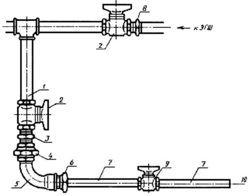 1 - провод 3/4²; 2 - диффузор 3/4²-1; 3 - тройник 1²; 4 - манометр; 5 - ниппель 1²; 6 - шариковый кран; 7 - ЭГШ; 8 - колено; 9 - ниппель 3/4²; 10 - выход воды