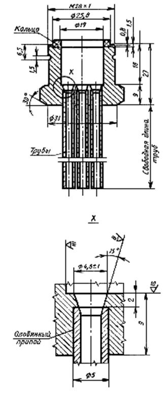 2.3. Эталонный генератор шума (ЭГШ) следует изготавливать из латуни (черт. 1). Испытываемую арматуру и ЭГШ размещают согласно черт. 2 на конце трубопровода.