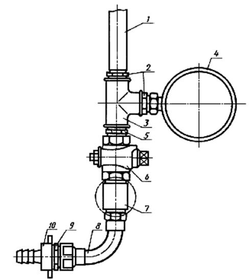На конце трубопровода должно быть разветвление для присоединения манометра испытываемой арматуры и ЭГШ согласно черт. 2.