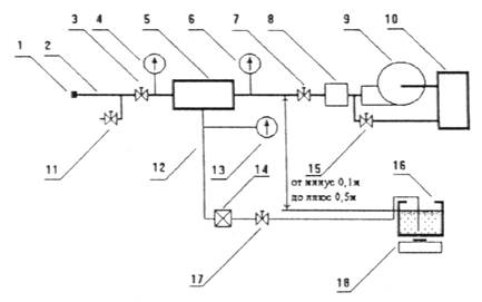 1 - сливной патрубок; 2 - трубопровод; 3 - запорный вентиль; 4 - манометр; 5 - испытываемый пеносмеситель (дозатор); 6 - манометр; 7 - вентиль регулировки расхода воды; 8 - расходомер; 9 - насосная установка; 10 - водопитатель; 11 - вентиль отбора пробы рабочего раствора; 12 - всасывающий трубопровод; 13 - манометр; 14 - запорный клапан; 15 - вентиль для сброса воды; 16 - емкость с запасом добавки; 17 - устройство регулирования расхода добавки; 18 - весы