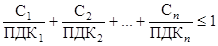 б) при осуществлении текущего санитарного надзора - сумма концентраций всех веществ, выраженная в процентах от соответствующих предельно допустимых концентраций для каждого вещества в отдельности, не должна превышать 100 %.