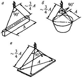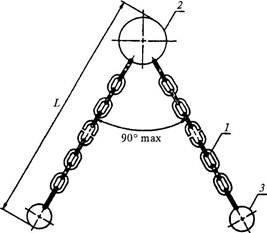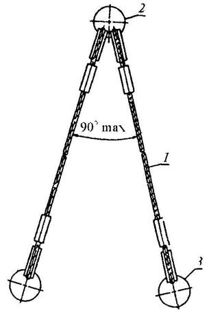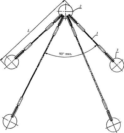 2.1.3. Определение усилий в канатах и цепях двух-, трех- и четырехветвевых стропов при отсутствии дополнительных требований производят исходя из условия, что углы между ветвями не превышают 90° (рис. 1).