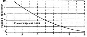 График 2. Зависимость внутреннего радиуса винтового пандуса от величины его уклона