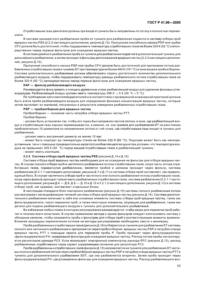 | Название рус.: | Единообразные предписания, касающиеся двигателей с воспламенением от сжатия, предназначенных для установки на сельскохозяйственных и лесных тракторах и внедорожной технике, в отношении выброса вредных веществ этими двигателями | | Название англ.: | Uniform provisions concerning the approval of comprеssion ignition engines to be installed in agricultural and forestry tractors and in non-road mobile machinery regard to the emission of pollutants by engines | | Дата актуализации текста: | 06.04.2015 | | Дата актуализации описания: | 01.07.2023 | | Дата издания: | 24.01.2006 | | Дата введения: | 01.01.2008 | | Дата окончания срока действия: | 01.09.2018 | | Код ОКП: | 475000 | | Взамен: | ГОСТ Р 41.96-99 | | Заменяющий: | ГОСТ Р 41.96-2011 | | Содержит требования: | Правила EEC UN № 96 | | Нормативные ссылки: | ГОСТ 18509-88; ГОСТ Р 41.24-2003; ГОСТ Р 41.85-99; ГОСТ Р ИСО 5725-1-2002; ГОСТ Р 52051-2003 | | Область применения: | Настоящий стандарт применяют в отношении выбросов газообразных вредных веществ и вредных частиц двигателей с воспламенением от сжатия, используемых: на транспортных средствах категории Т с установленной полезной мощностью более 18 кВт, но не более 560 кВт; в технике, предназначенной и пригодной для передвижения или перемещения по грунту, будь то по дороге или бездорожью, с установленной полезной мощностью более 18 кВт, но не более 560 кВт, эксплуатируемой в разных скоростных режимах | | Список изменений: | №0 от 01.03.2014 (рег. 25.02.2014) «Восстановлен на территории РФ» №0 от 31.08.2018 (рег. 18.07.2018) «Текстовое изменение; Изменено заглавие» | |
