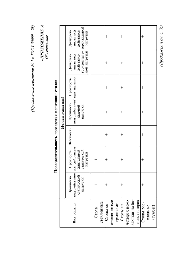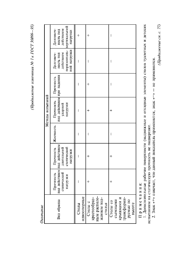 | Область применения: | Настоящий стандарт распространяется на столы обеденные, туалетные и детские дошкольные и устанавливает методы испытания на: прочность под действием статической нагрузки; прочность под действием длительной статической нагрузки; жесткость; прочность под действием ударной нагрузки; прочность при падении; долговечность под действием горизонтальной нагрузки; долговечность под действием вертикальной нагрузки. Стандарт не распространяется на столы складные и детские игровые |