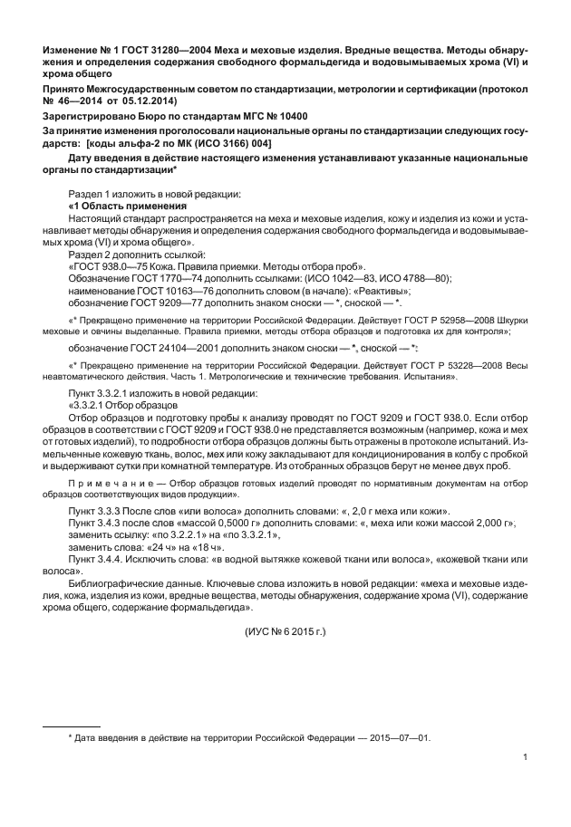 | Область применения: | Настоящий стандарт распространяется на меха и меховые изделия и устанавливает методы обнаружения и определения содержания свободного формальдегида и водовымываемых хрома (VI) и хрома общего |