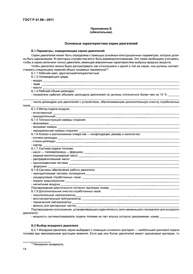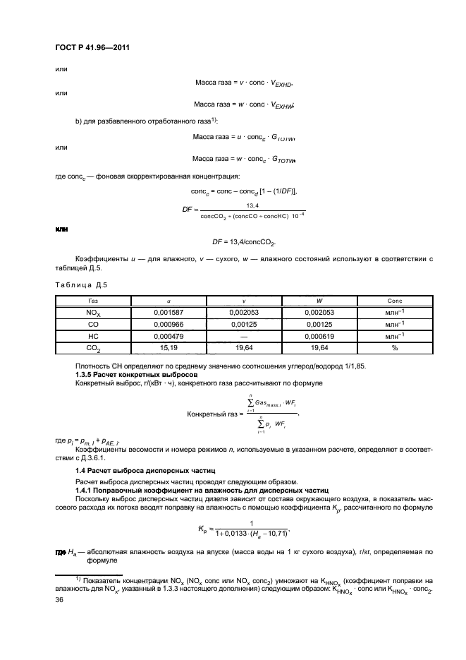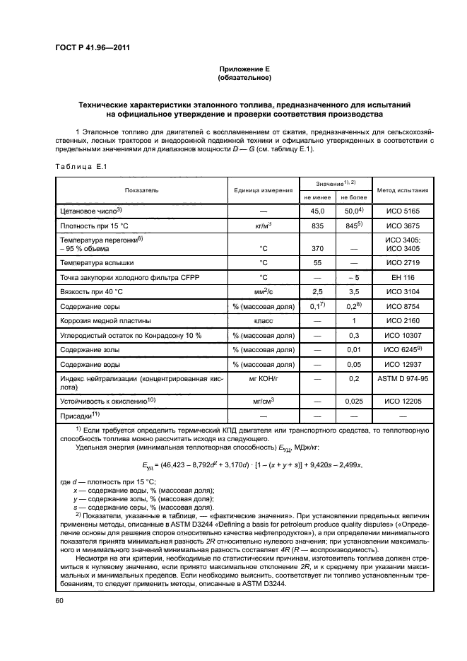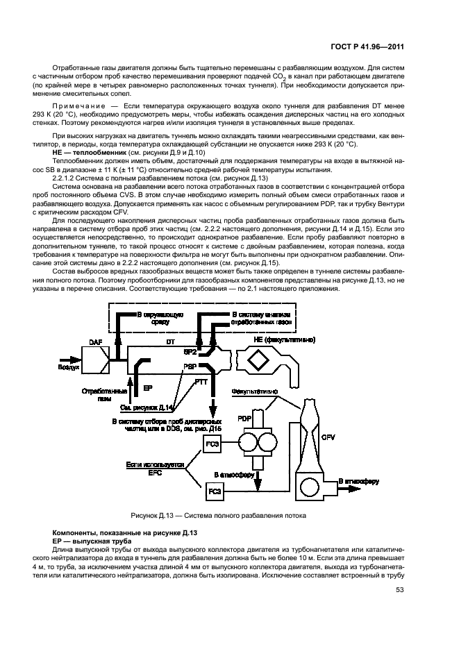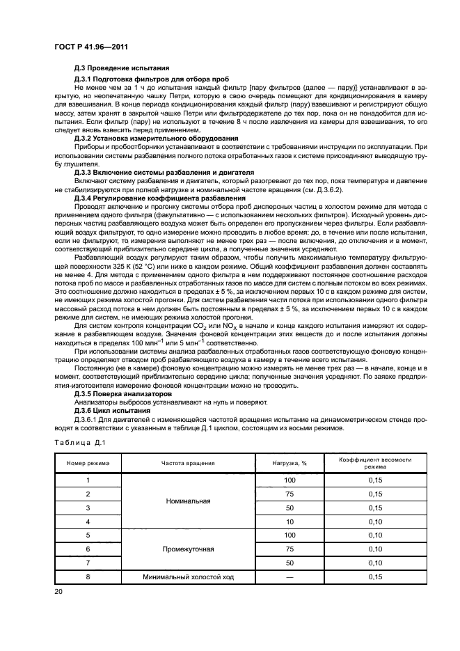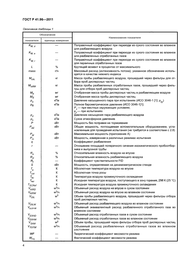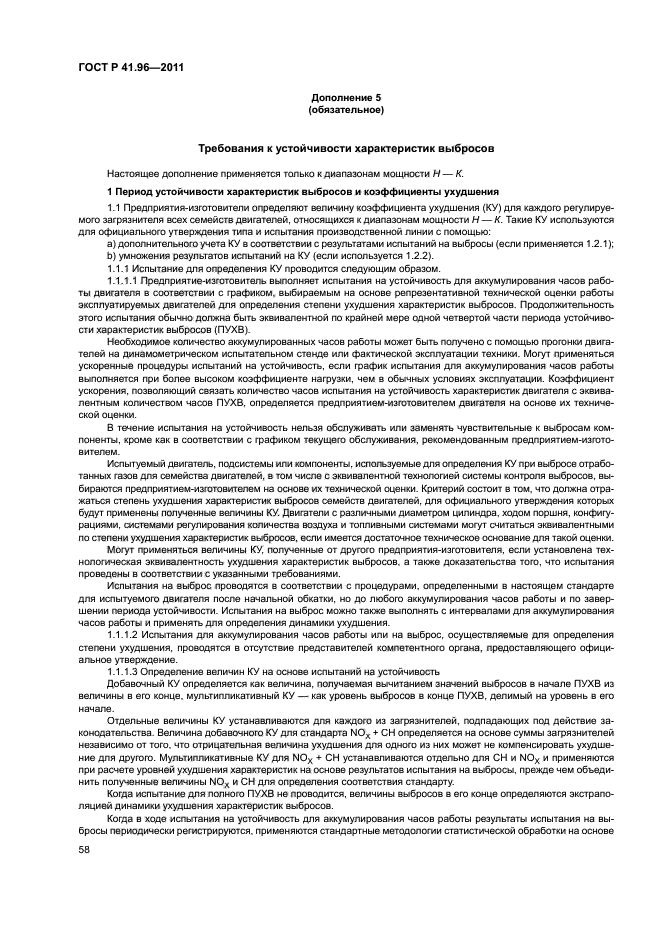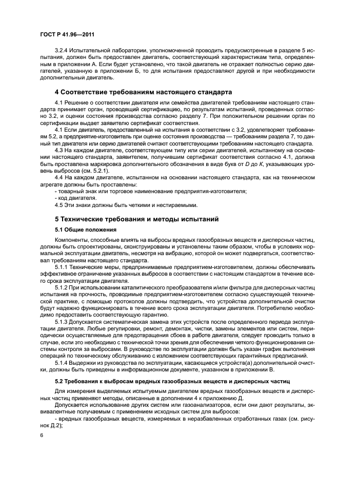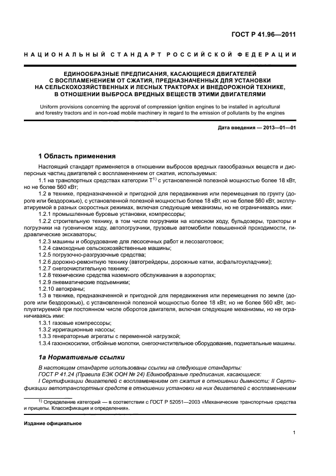 | Название рус.: | Единообразные предписания, касающиеся двигателей с воспламенением от сжатия, предназначенных для установки на сельскохозяйственных и лесных тракторах и внедорожной технике, в отношении выброса вредных веществ этими двигателями | | Название англ.: | Uniform provisions concerning the approval of compression ignition engines to be installed in agricultural and forestry tractors and in non-road mobile machinery in regard to the emission of pollutants by the engines | | Дата актуализации текста: | 01.01.2021 | | Дата актуализации описания: | 01.07.2023 | | Дата издания: | 29.06.2020 | | Дата введения: | 01.01.2013 | | Код ОКП: | 475000 | | Взамен: | ГОСТ Р 41.96-2005 | | Содержит требования: | Правила ЕЭК ООН № 96 | | Нормативные ссылки: | ГОСТ Р 41.24; ГОСТ Р ИСО 5725-1; ГОСТ 18509 | | Область применения: | Настоящий стандарт применяется в отношении выбросов вредных газообразных веществ и дисперсных частиц двигателей с воспламенением от сжатия | |